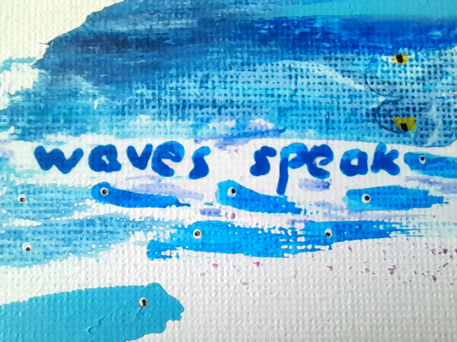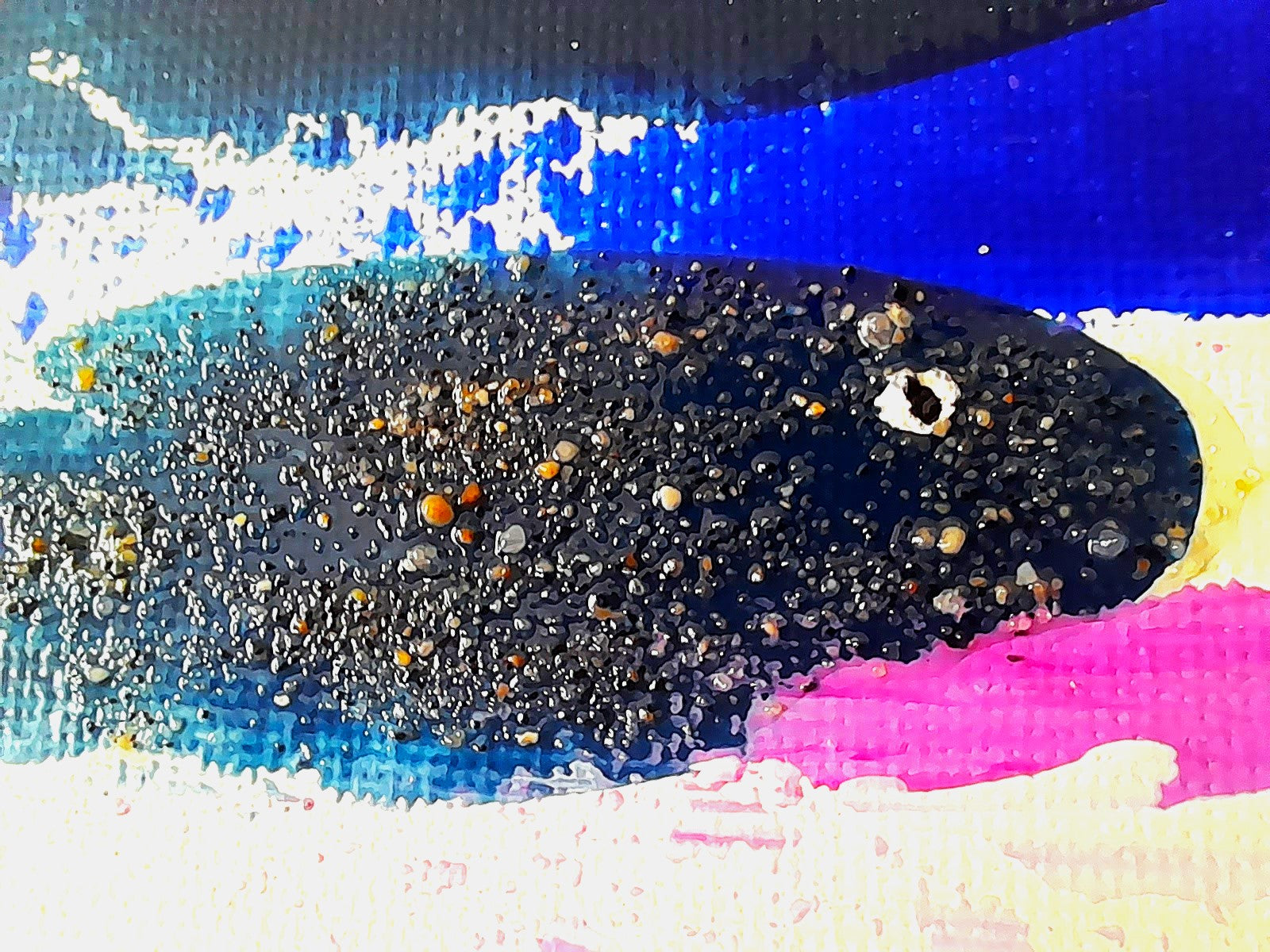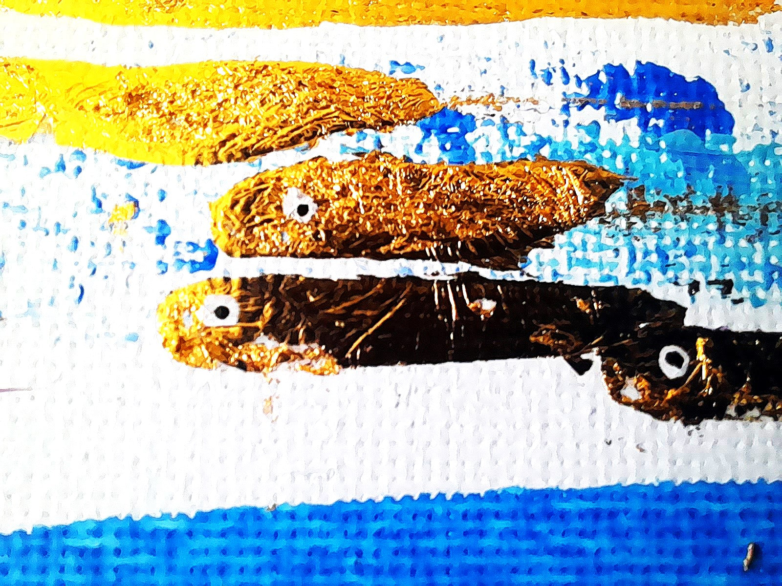 A tiddli original in the Ocean Gliders series. Fresh, bright, positive and full of freedom, movement and energy. Meaningful, supportive, thought-provoking messaging - all explained in the signature letter from tiddli in the red envelope. "Touch my painting and you touch the sea": distilled sea water mixed in the paint, embedded whelk shell, beach sand, 24-carat gold leaf fish, one white fish with a red eye. The painting is sealed and touchable. Painted by the sea at Hill Head on the Solent.