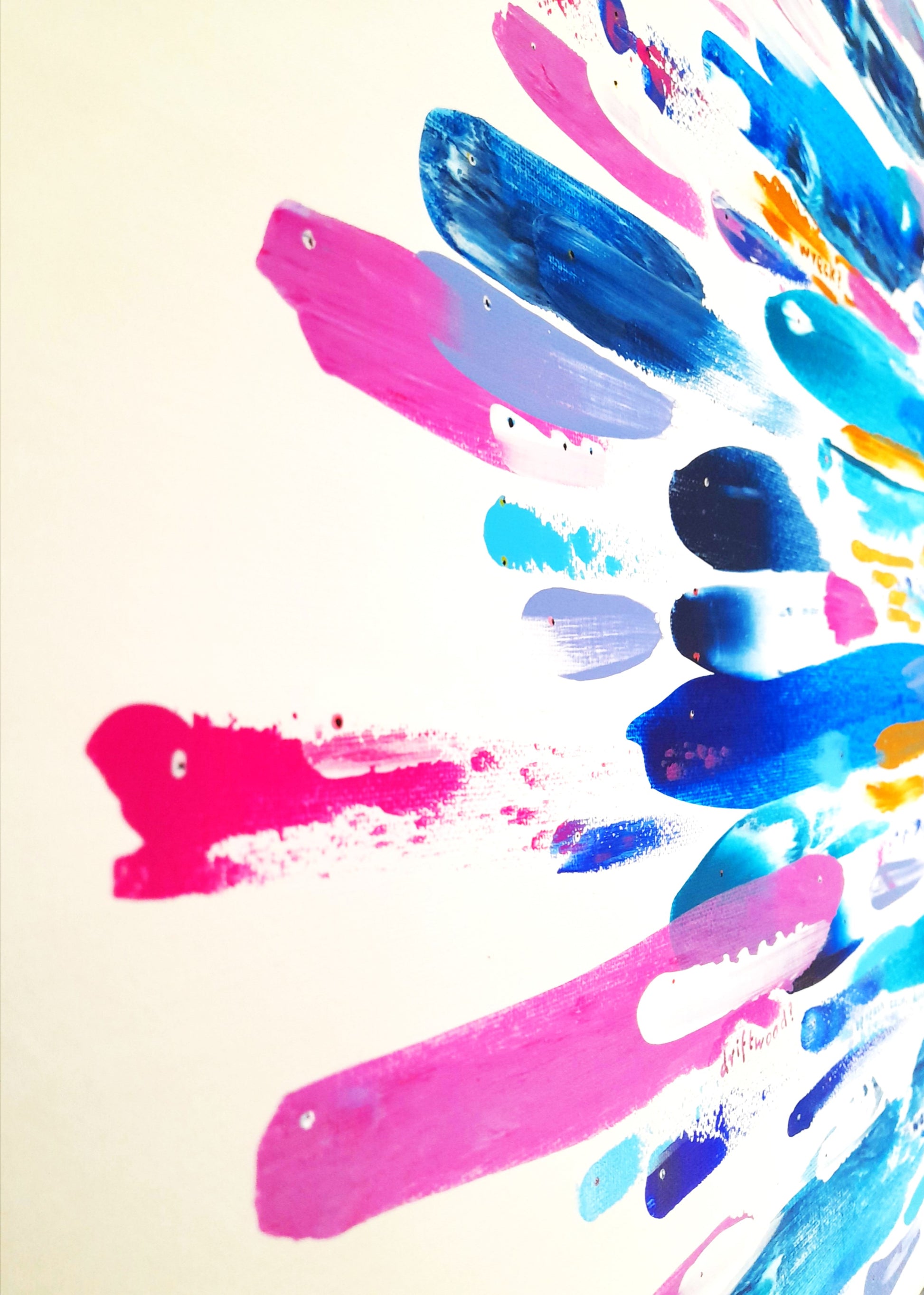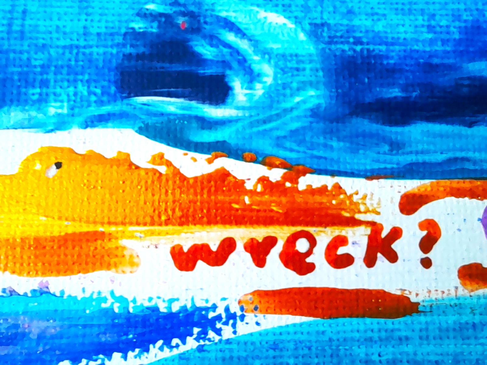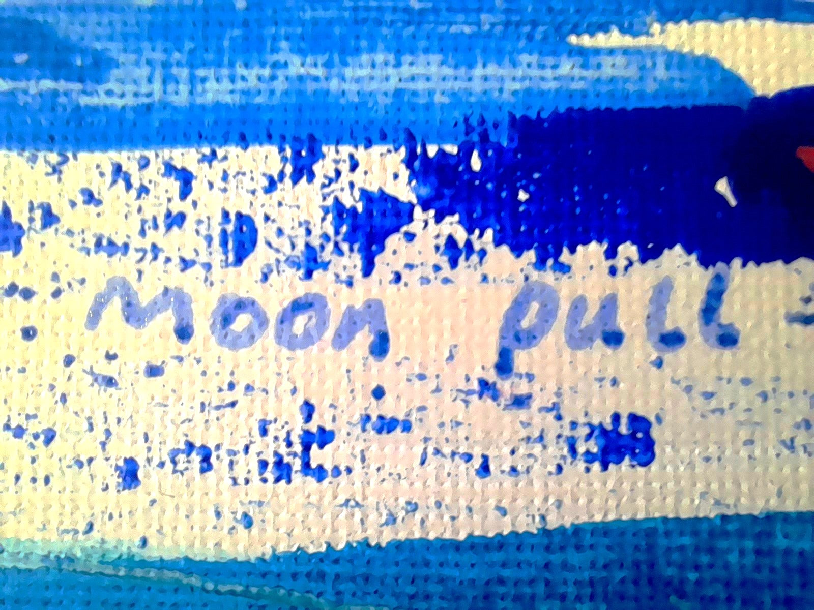 A tiddli original in the Ocean Gliders series. Fresh, bright, positive and full of freedom, movement and energy. Meaningful, supportive, thought-provoking messaging - all explained in the signature letter from tiddli in the red envelope. "Touch my painting and you touch the sea": distilled sea water mixed in the paint, embedded whelk shell, beach sand, 24-carat gold leaf fish, one white fish with a red eye. The painting is sealed and touchable. Painted by the sea at Hill Head on the Solent.