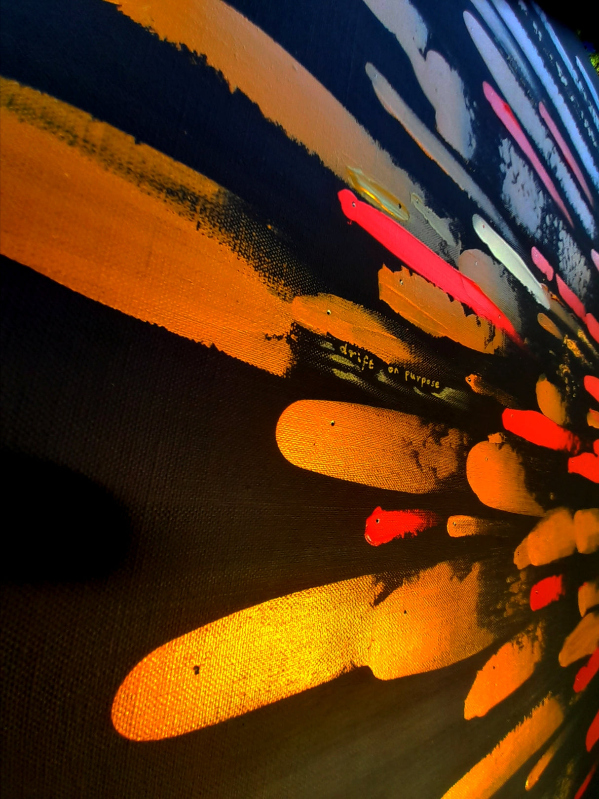 A tiddli original, stunningly stylish and with deeply meaningful and emotive messaging. Movement, energy, vibrancy, black with red and gold abstract fish. Oh, and one white fish. "It's all about connecting - touch my painting and you touch the sea": distilled sea water in the paint, embedded whelk shell, beach sand, small areas of 24-carat gold leaf, one white fish, one blue fish, positive wording. The work is sealed and touchable. Painted by the sea at Hill Head on the Solent.